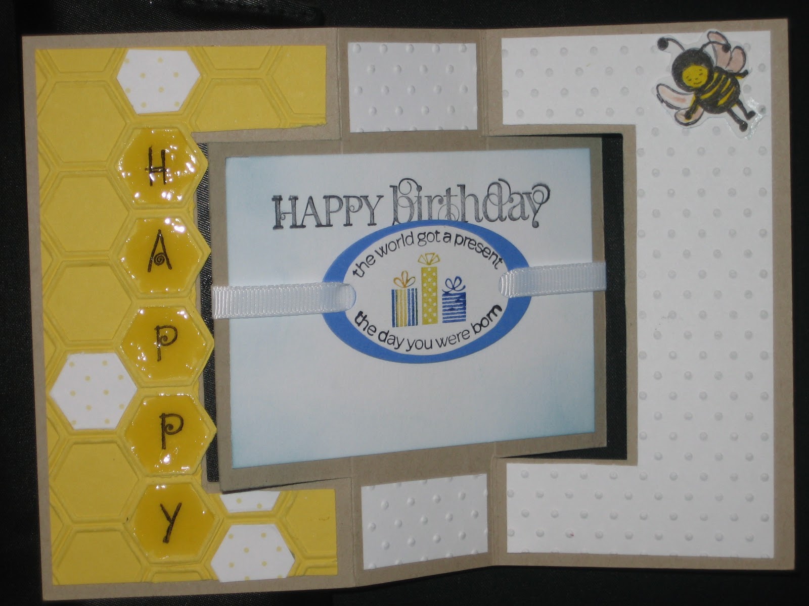 Here are some smaller photos of the other views. I cut the bees and used dimensionals to make them pop up. Because I am OBEE it has an added significance (: Happy birthday is stamped with curly verses, which I use all the time! I am still trying to make the opened card look more together and in looking back, maybe should have chosen an orange and chocolate chip combo?